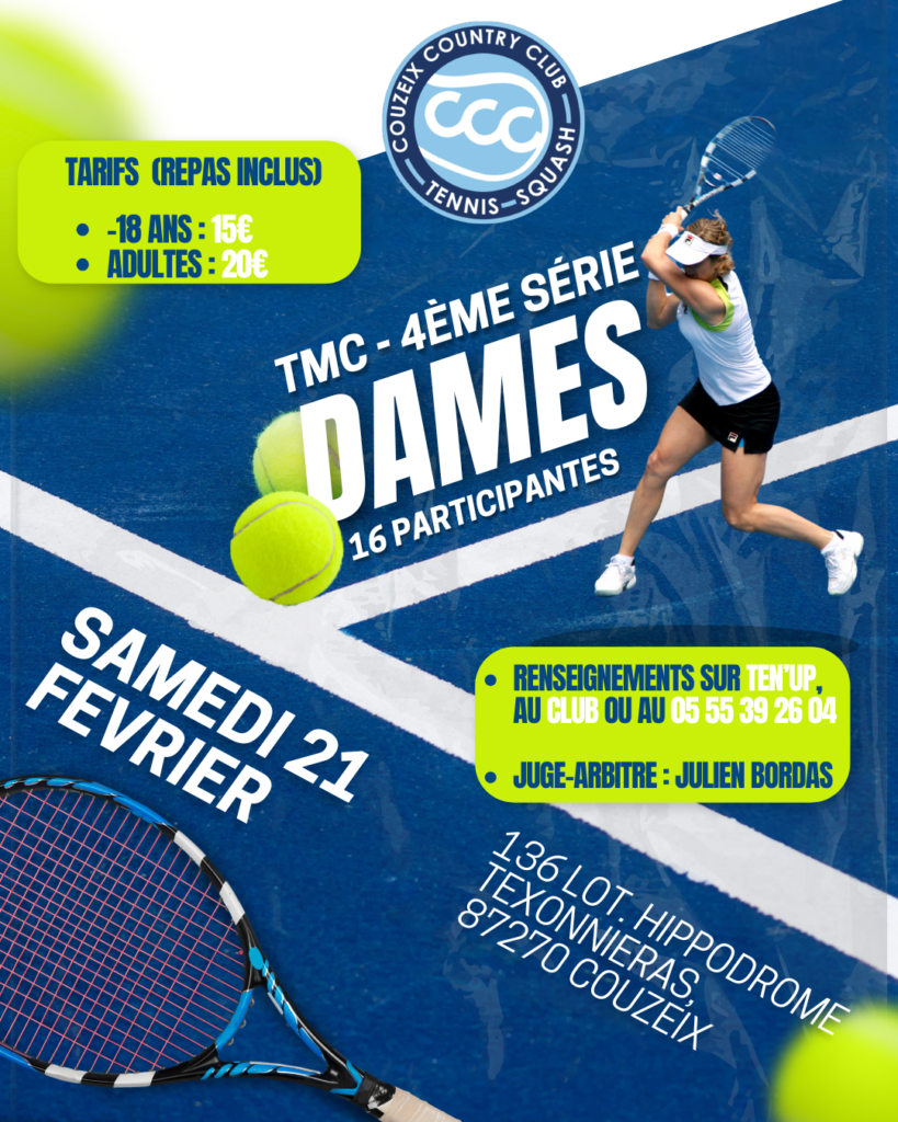Venez passer une petite journée tennistique au club le 18 février (changement de dates). Nous organisons un TMC dames 4ème série. La gagnante sera invitée au pôle de Limoges pour effectuer la finale.